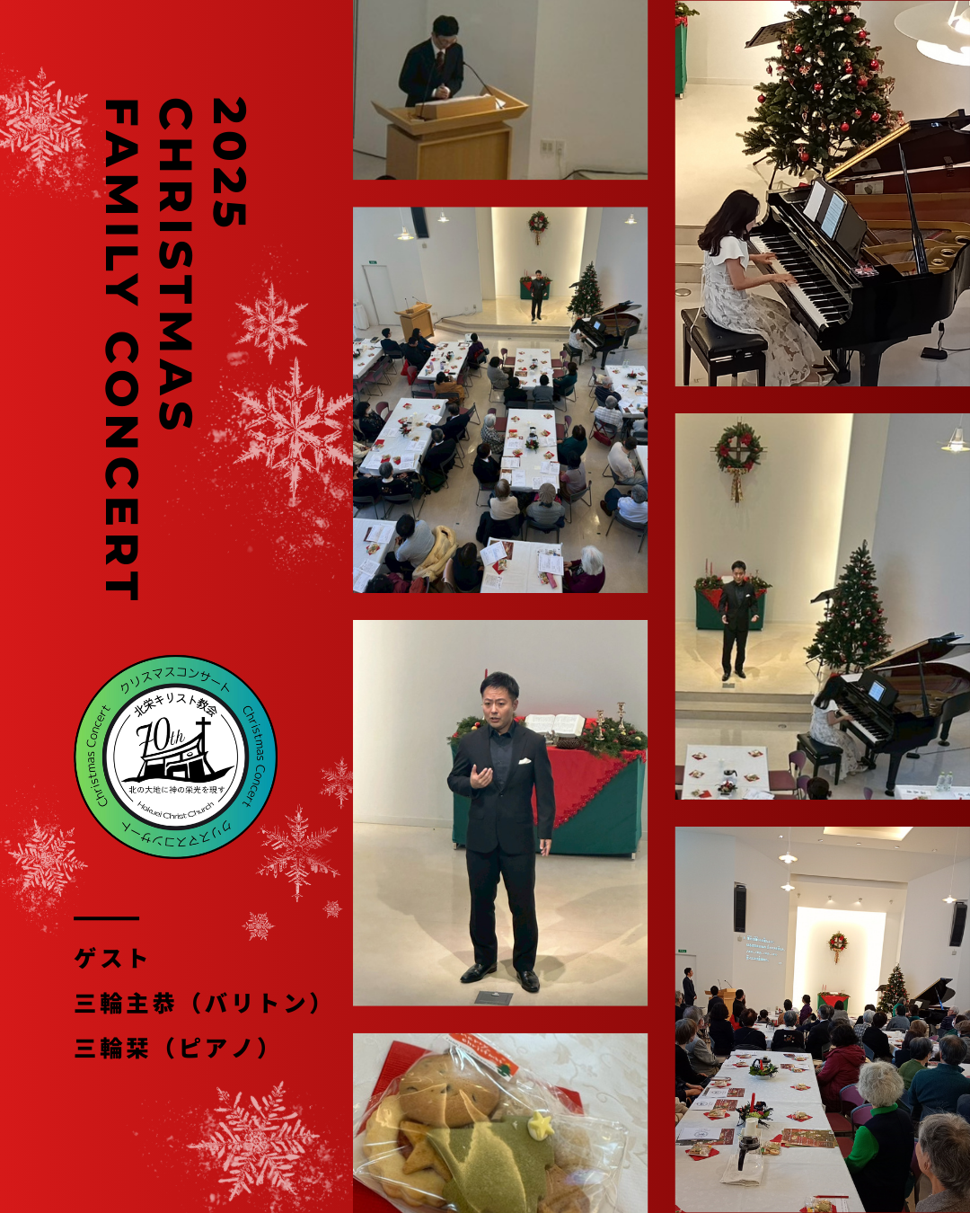 クリスマスファミリーコンサート 2025年10月19日| 2025年12月7日日曜日 6年ぶりのクリスマスファミリーコンサートを開催することができました。 たくさんの方にお越しいただき、ありがとうございました。 素敵な歌声と演奏を届けてくださったゲストの三輪主恭さん、栞さんに こころから感謝いたします。 Categories: イベント