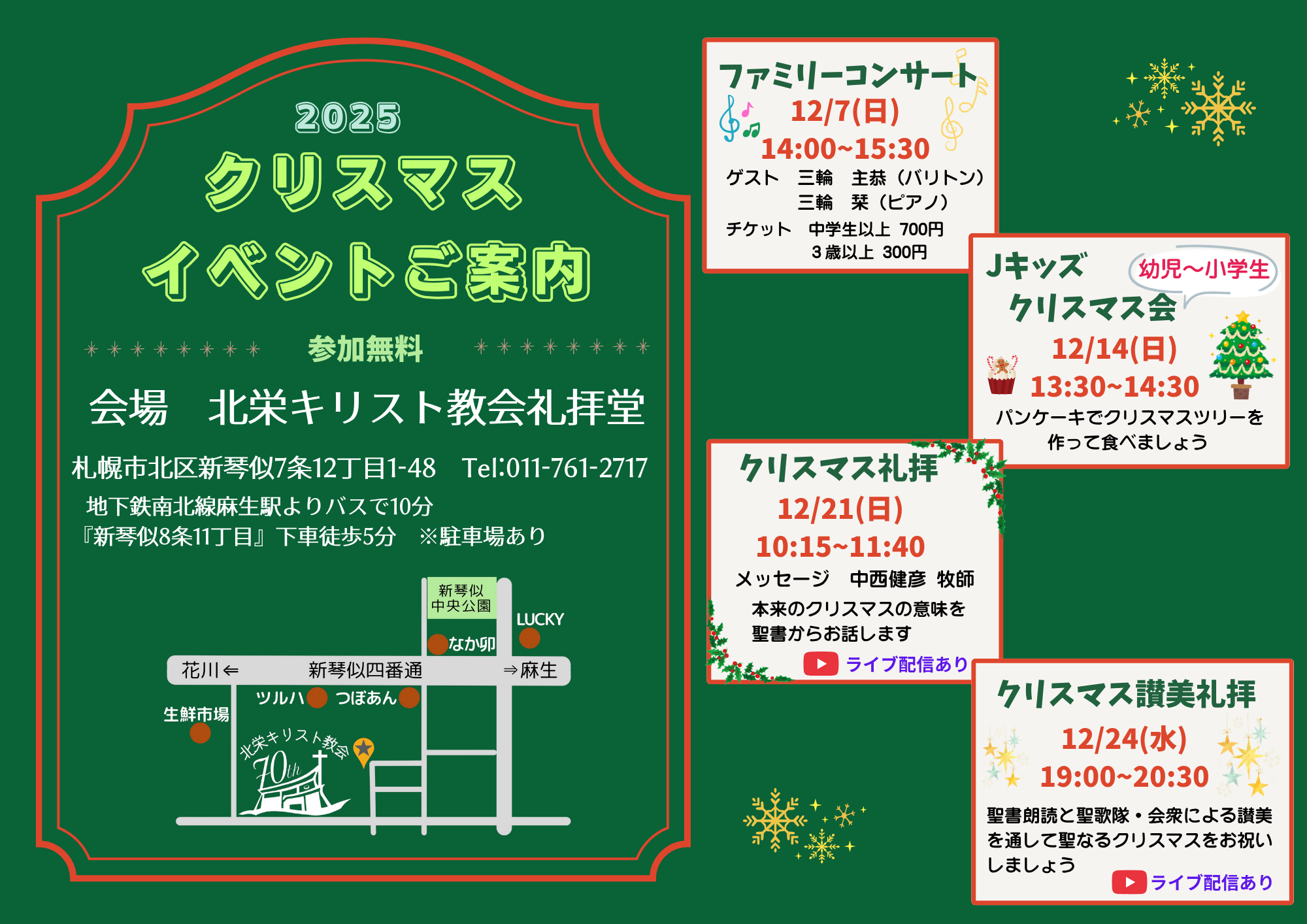 教会は、どなたにでも開かれた所です。混沌とした世の中で、いつの時代も変わらない確かなものがここにあります。「少し話を聞いてみたい」という方も、「祈ってほしい」という方も、このクリスマスの機会に、どうぞ一度お立ち寄りください。皆さまのお越しをお待ちしています。