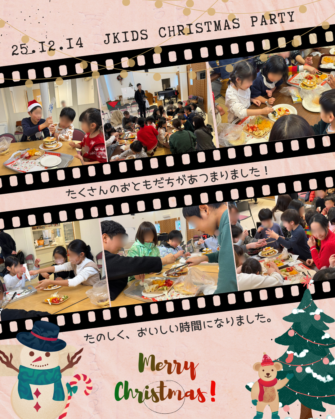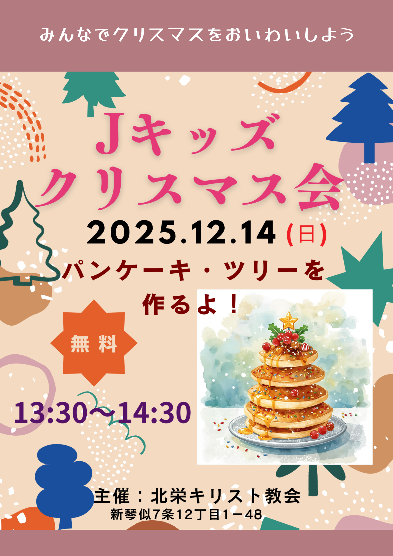 Jキッズクリスマス会 2025年11月8日| とき:2025年12月14日(日) 13:30〜14:30 ところ:北栄キリスト教会 礼拝堂 6月・9月のキッズフェスティバルにつづき、 こどもむけイベント「Jキッズキッズキッズ」のクリスマス会を開催しました。 クイズにチャレンジしたり、クリスマスソングをうたって、聖書のお話もききました。 パンケーキツリーづくりも、グループで協力して立派なツリーができました。みんなでおいしくいただいて、楽しい時間となりました。 Categories: イベント